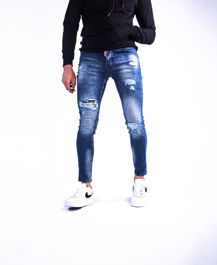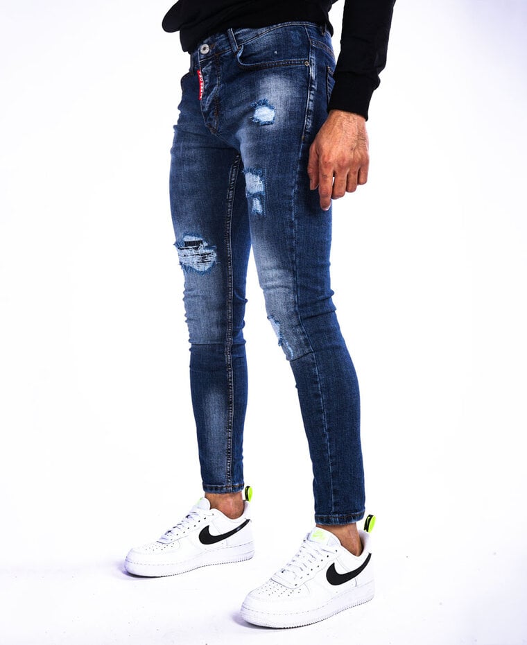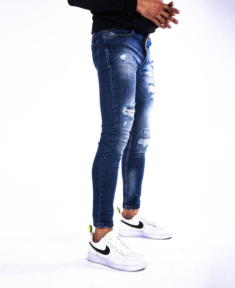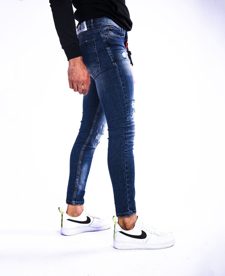 Deze blauwe jeans voor heren met scheuren is perfect voor een stoere en eigentijdse look. Voorzien van opvallende distressed details op het bovenbeen en de knie, waardoor de jeans een robuuste urban uitstraling krijgt. Gemaakt van comfortabele stretch denim met een moderne pasvorm. Combineer deze blauwe jeans eenvoudig met sneakers, een hoodie of een basic t-shirt. Shop jouw nieuwe blauwe jeans met scheuren nu bij ModaTotaY.